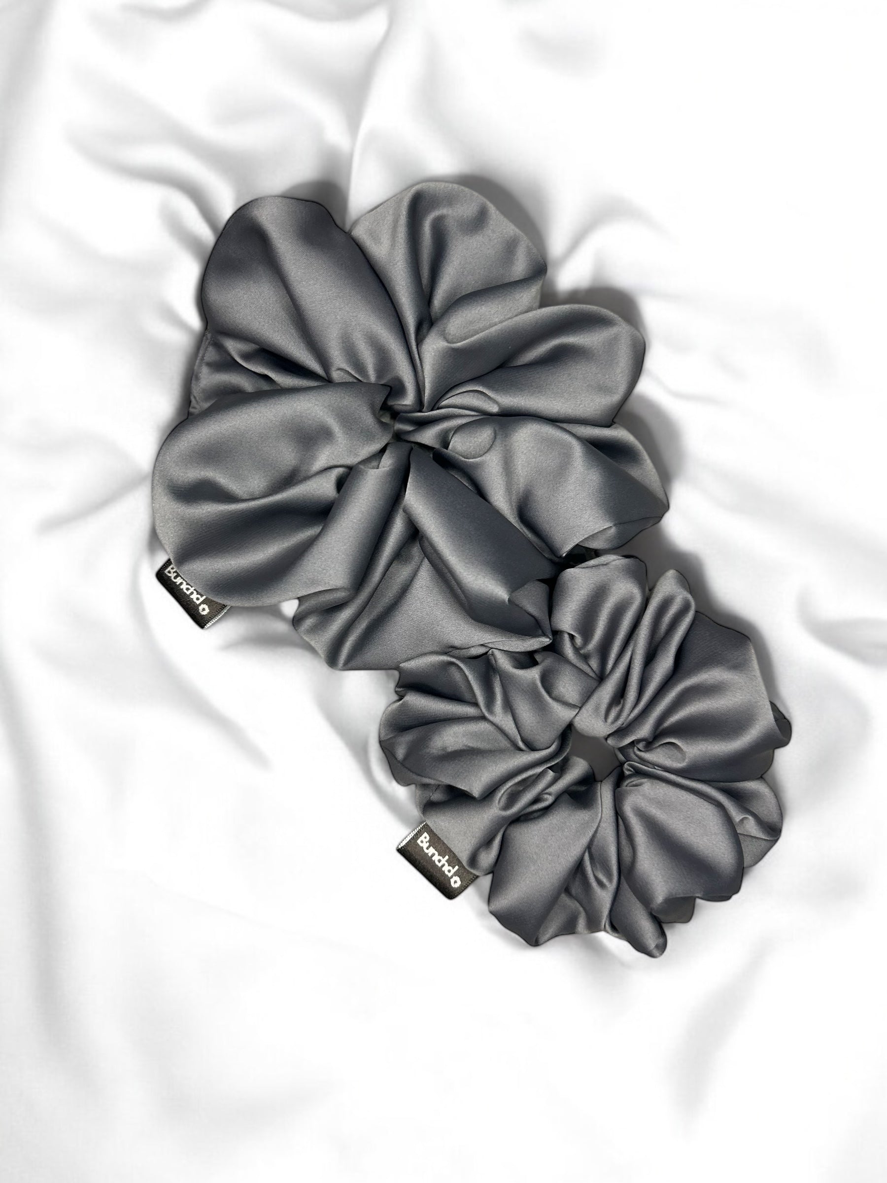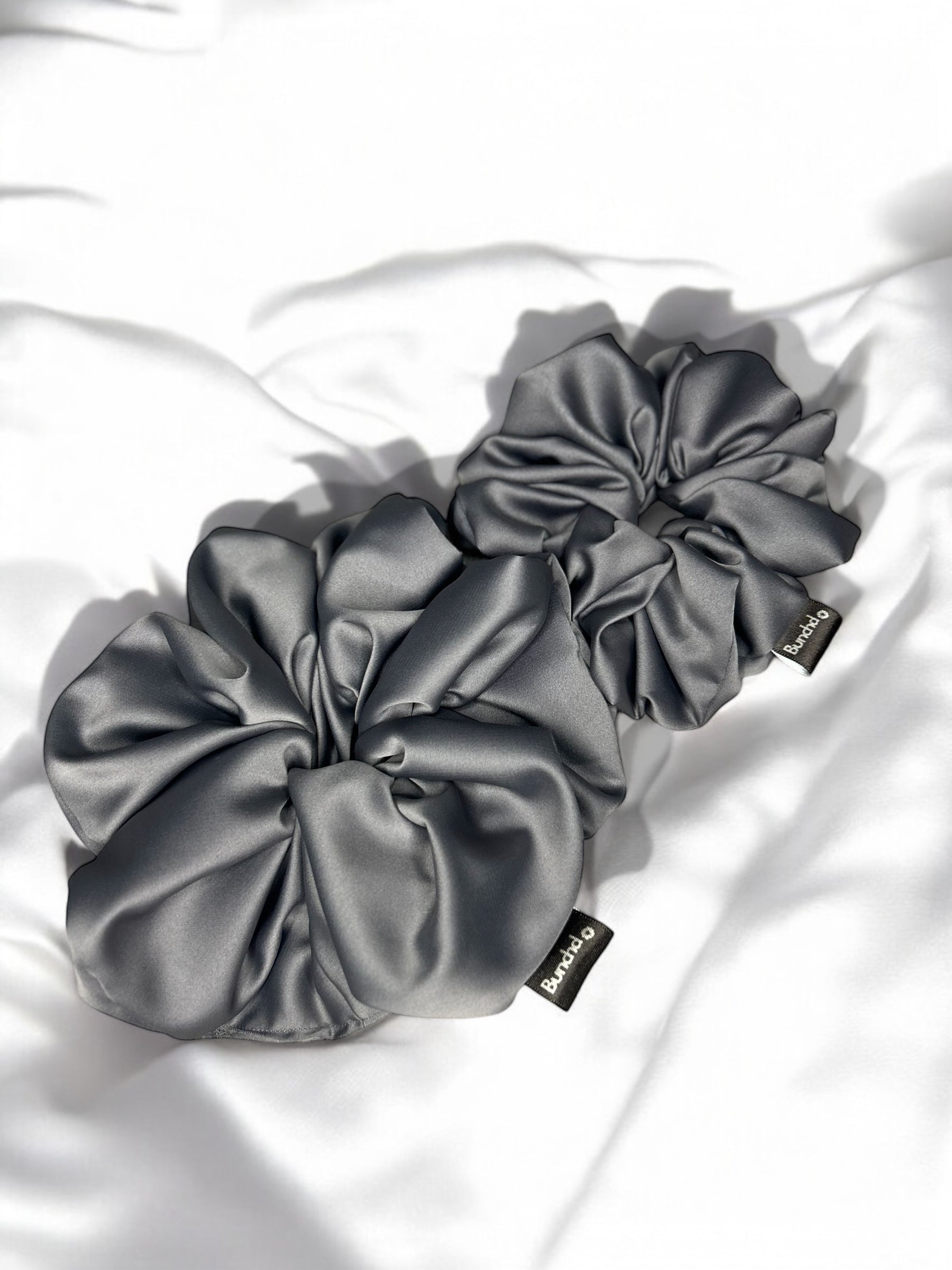The Dolphin Grey Bunchd Scrunchie Set features two luxurious micro satin scrunchies in a soothing, neutral shade. The set includes one large scrunchie, perfect for voluminous ponytails or loose, relaxed hairstyles, and one medium scrunchie, ideal for creating a more refined look. Both scrunchies offer a smooth, silky texture that reduces hair breakage while adding a touch of elegance to your everyday style. Whether worn in your hair or as an accessory on your wrist, these scrunchies bring a soft, polished finish to any look.