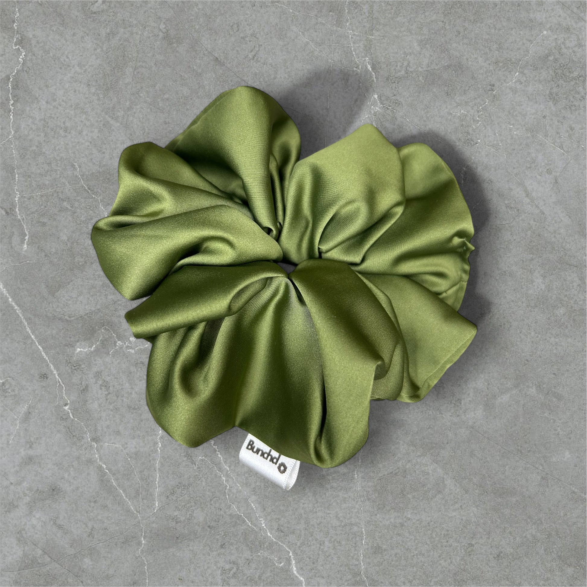 Is made from a soft, fabric in a rich, earthy olive green colour. The scrunchie features a gathered, puffy design that adds texture and volume to your hair, making it both functional and stylish. Its muted, natural hue gives it a versatile, understated look that pairs well with a variety of outfits, from casual to more polished styles. The fabric could range from cotton to satin or velvet, offering different levels of sheen and softness. Ideal for securing ponytails, buns, or braids, the olive scrunchie is both a practical and chic addition to any hair accessory collection.