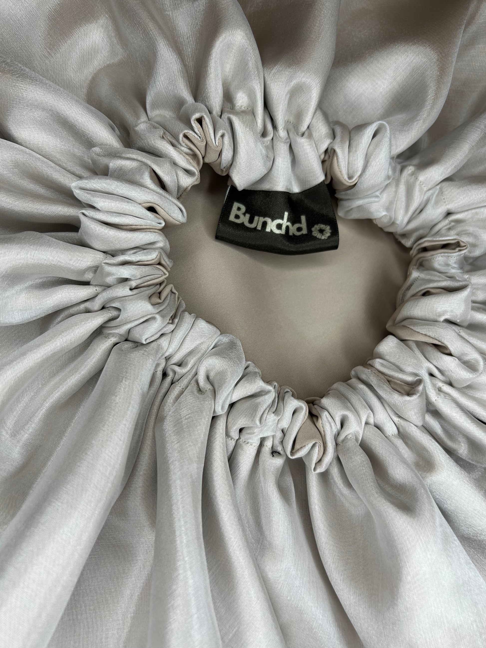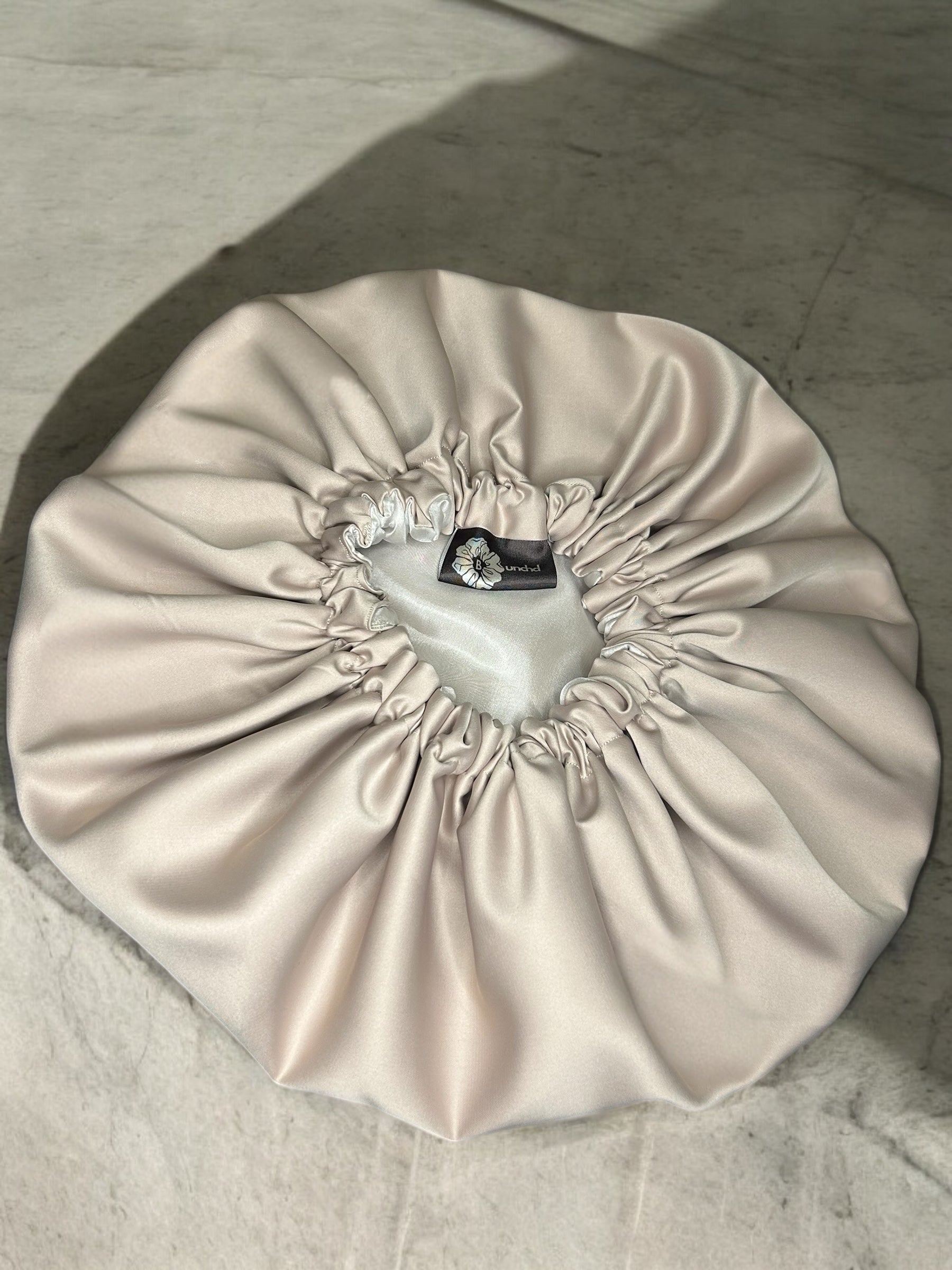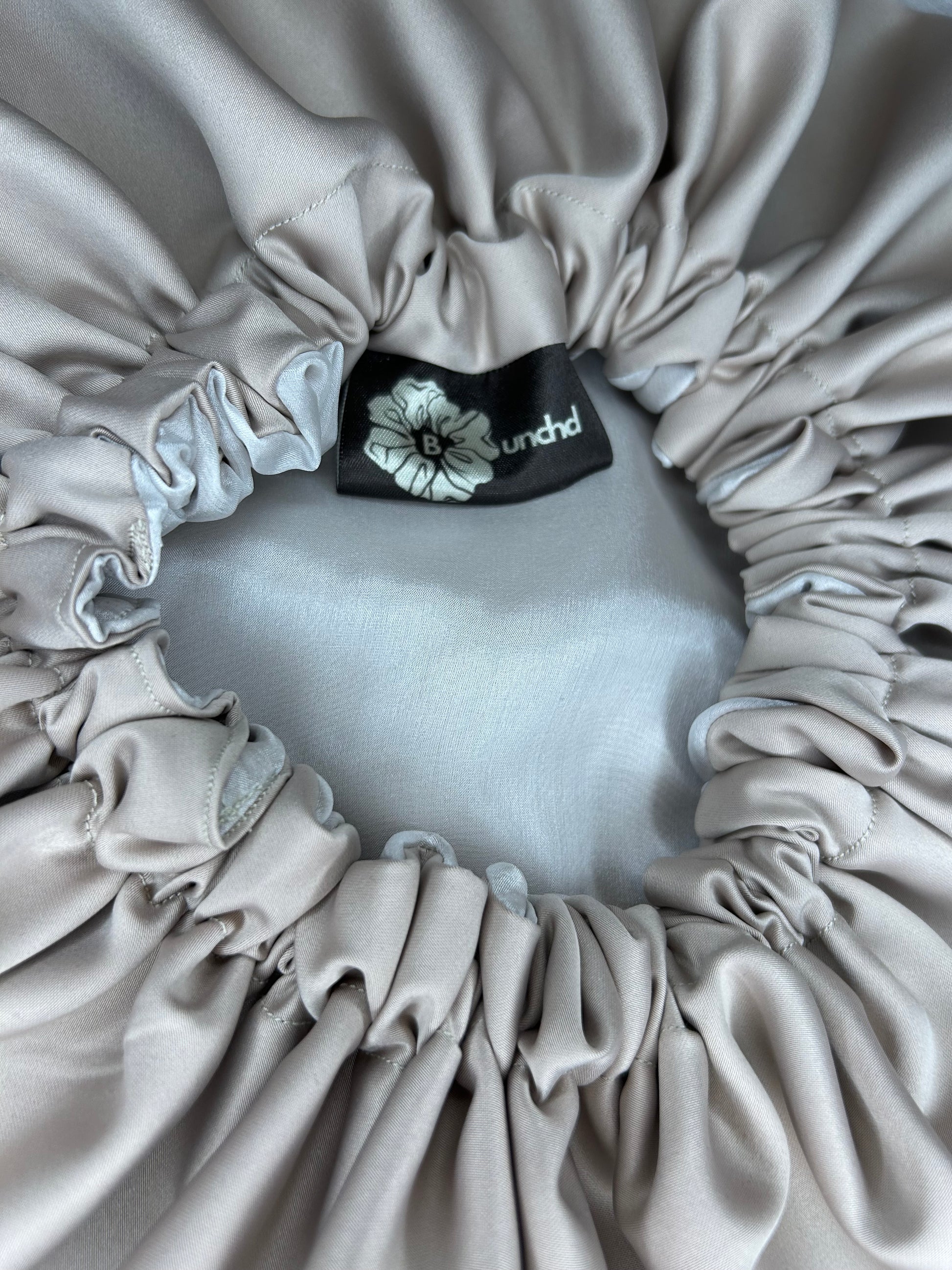This silk-lined Taupe Champagne Bonnet features a luxurious inner lining crafted from 100% raw silk, known for its natural, soft texture and rich, unrefined quality. The raw silk provides a smooth, breathable surface that gently protects your hair, reducing friction and minimizing frizz. Its organic finish offers a subtle sheen, giving the bonnet an elegant and refined appearance. Ideal for preserving hair health, the bonnet's raw silk lining helps retain moisture, prevents hair breakage, and promotes a silky, smooth texture, making it an essential accessory for those seeking both comfort and beauty. The outer layer complements this premium interior with a durable and stylish design, ensuring a perfect blend of function and fashion.